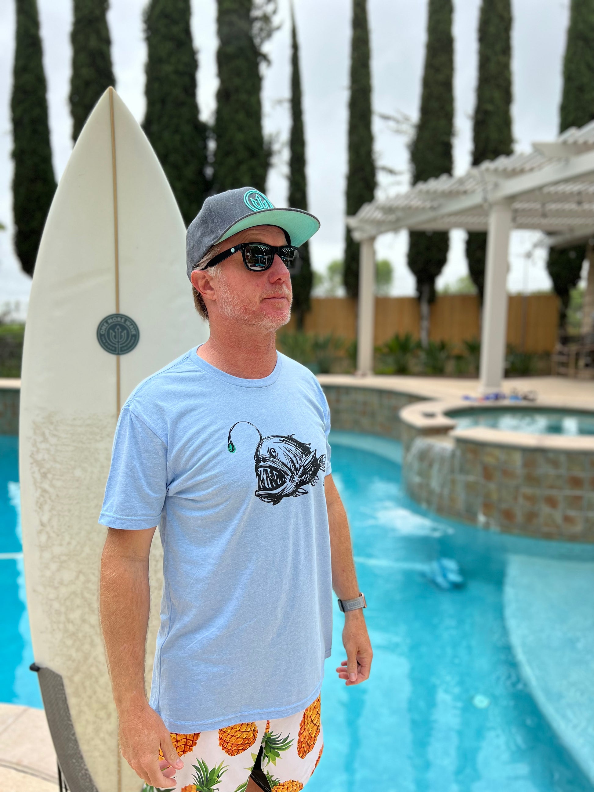 Introducing the captivating T-shirt that brings together the mystical allure of the deep sea and showcases fantastic support of One More Wave. This unique shirt features a drawing of an anglerfish showcasing its mesmerizing bioluminescent lure. The strokes of the pencil create a level of detail, capturing the anglerfish's mysterious and ferocious essence.